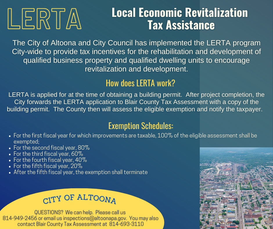 Under the provisions of the City of Altoona Ordinance No. 5797 adopted by Altoona City Council on December 5, 2022 a city-wide LERTA program is available as tax incentive for the rehabilitation and development of qualified business property and qualified residential dwelling units within the City limits of the City of Altoona. The purpose of the program is to encourage property improvements and eliminate blight.